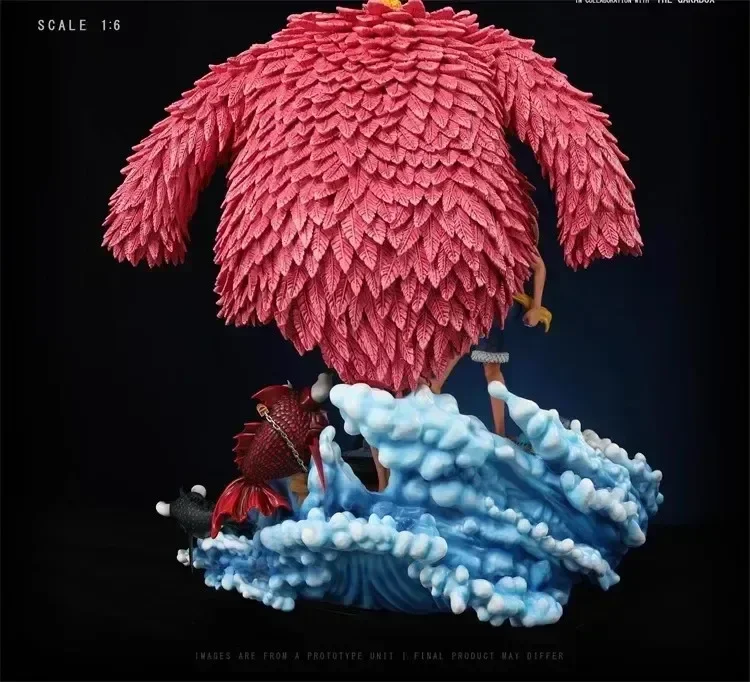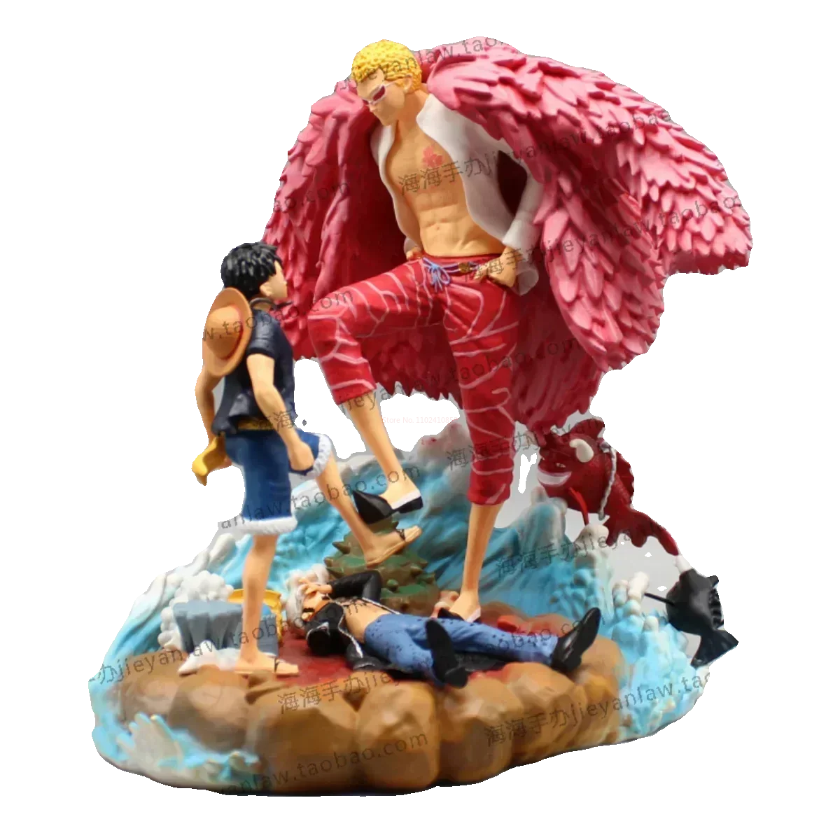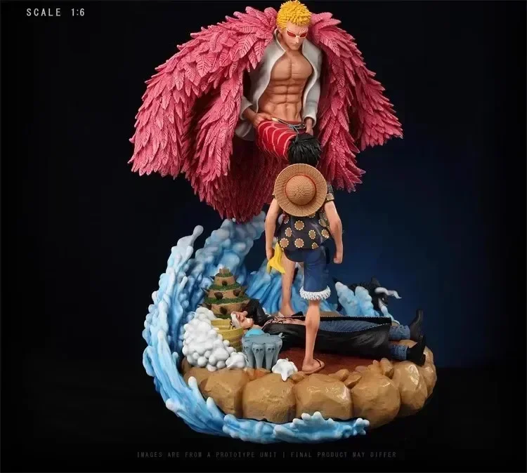 • Epic Battle Scene: The figurine portrays Luffy and Doflamingo locked in combat, capturing the moment from their brutal showdown in the Dressrosa Arc. The pose reflects both characters’ power and determination, with Luffy in his signature Gear 4 form and Doflamingo showcasing his String-String Devil Fruit abilities.